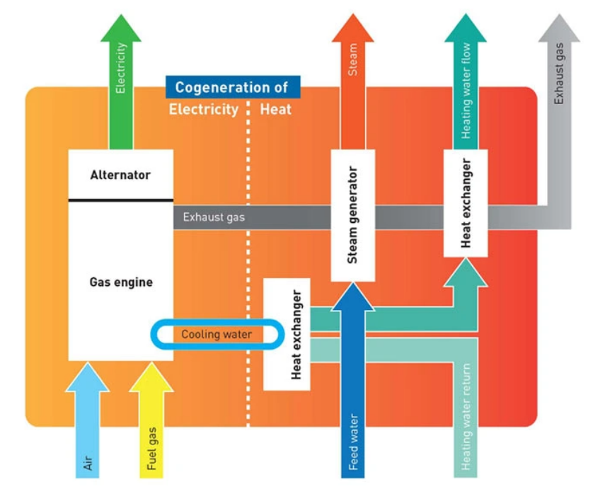در نیروگاه های تولید همزمان، هر دو انرژی حرارتی و انرژی الکتریکی مورد استفاده می گیرند. بسته به کاربرد، راندمان کلی سیکل می تواند به بیش از 90 درصد برسد. دو نوع گرما در حین کار از دود خروجی موتور در دسترس است: گرمای سیال خنک کننده و انرژی گرمایی.
