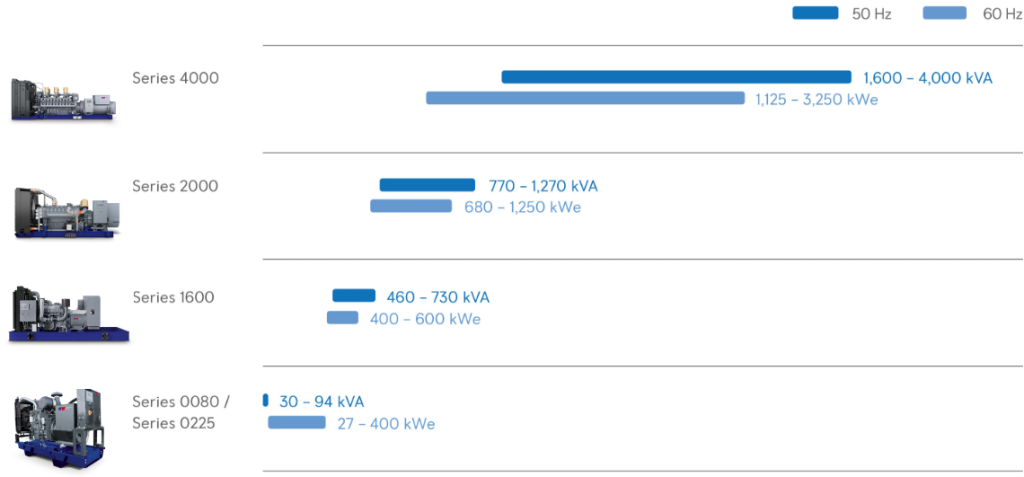 مشتریان ما اعتماد دارند تا توان قابل اعتمادی را برای طیف گستردهای از کاربریها، مانند نیروگاههای مستقل مراکز بهداشتی، مراکز داده، فرودگاهها، کارخانههای تولیدی، کارخانههای تصفیه فاضلاب ارائه کنیم. مجموعه محصولات ما مجموعه های دیزل ژنراتور تا 3250 کیلو وات (60 هرتز) و تا 4000 کیلو ولت آمپر (50 هرتز) را پوشش می دهد.